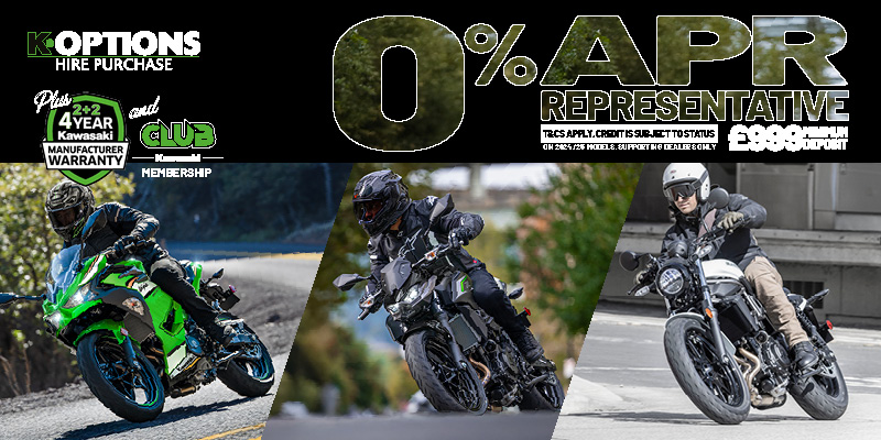 Enjoy 0% APR on HP and 5.9% PCP APR Representative on a wide range of Kawasaki machines!